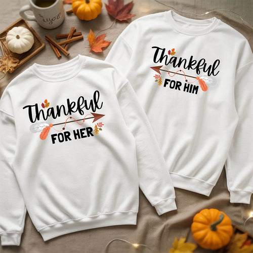 Thankful For Her/Him Thanksgiving Couple Sweatshirt – Cute Matching Holiday Crew Neck