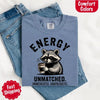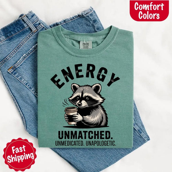 Meet the caffeinated raccoon that perfectly matches your energy level: zero chill, full chaos, and highly questionable decisions. This "Energy Unmatched" Comfort Colors® T-shirt is for the wild ones who power through their day on iced coffee, anxiety, and vibes alone.