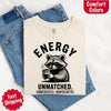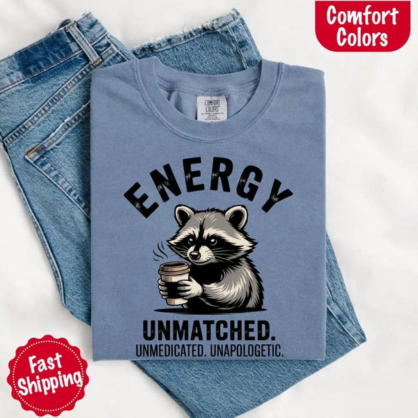 ☕ Match your chaotic energy with the only raccoon who gets it — grab your “Energy Unmatched” tee today.