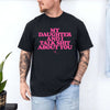 The image shows a black T-shirt with bold pink text. The text reads, "MY DAUGHTER AND I TALK SHIT ABOUT YOU." A small heart symbol is below the text. The T-shirt is modeled by a person with tattoos on their arms. The outfit includes jeans, suggesting a casual look. This T-shirt is ideal for those who appreciate a bold, humorous message.