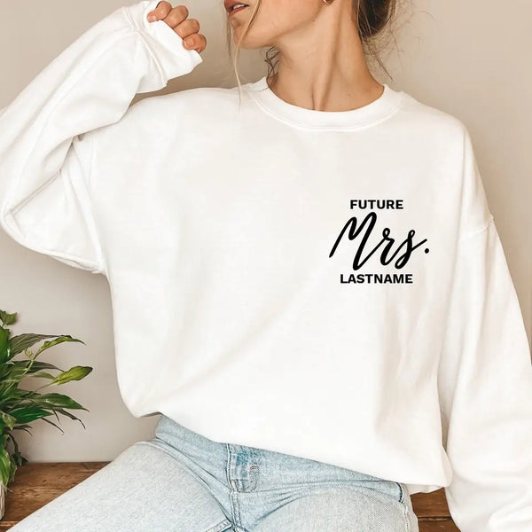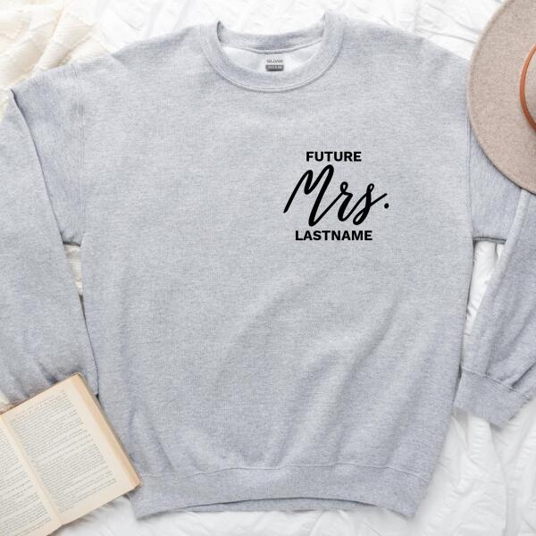 Our Future Mrs. Personalized Sweatshirt effortlessly combines style and sentiment, making it a versatile addition to any bride-to-be's wardrobe. It's the perfect choice for those moments when she wants to feel comfortable, cozy, and still radiate bridal charm. Embrace the opportunity to surprise her with a gift that reflects her exciting path towards becoming a Mrs. Order the Future Mrs. Personalized Sweatshirt today and make her smile as she embraces this beautiful milestone in her life.