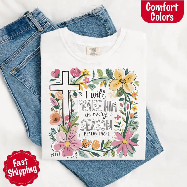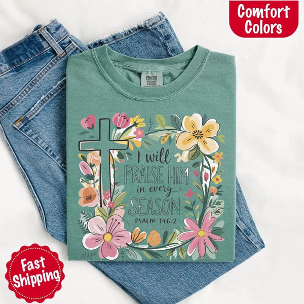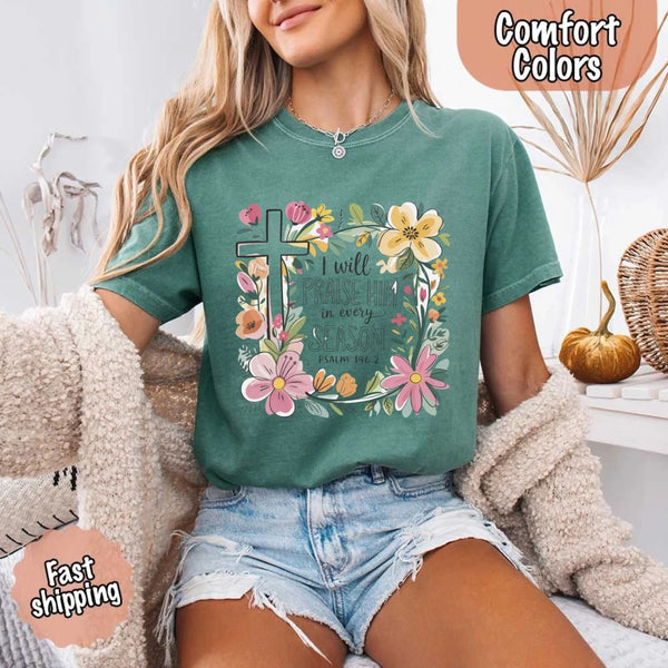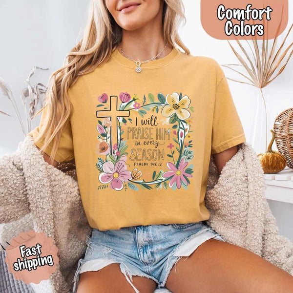 I Will Praise Him in Every Season Comfort Colors Tee – Christian Floral Cross Shirt