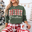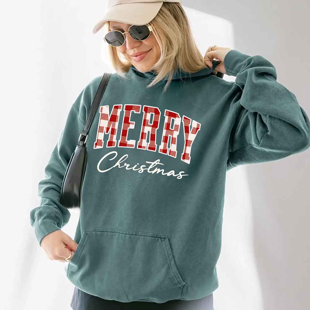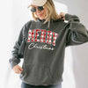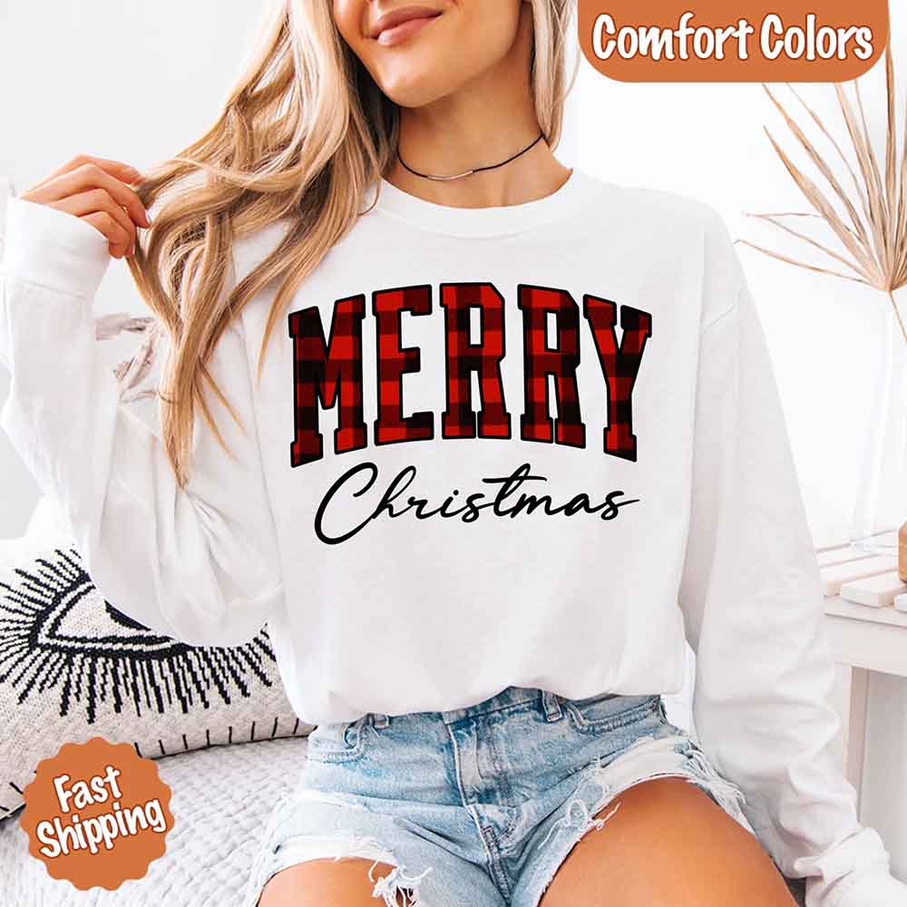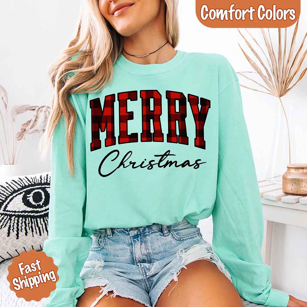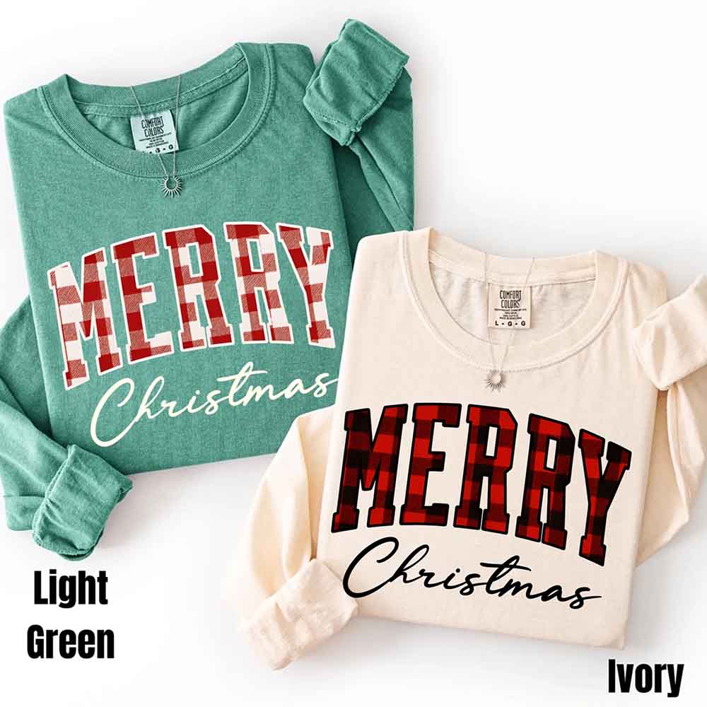 Merry Christmas Comfort Colors Matching Long Sleeve Shirts - Buffalo Plaid Hoodie