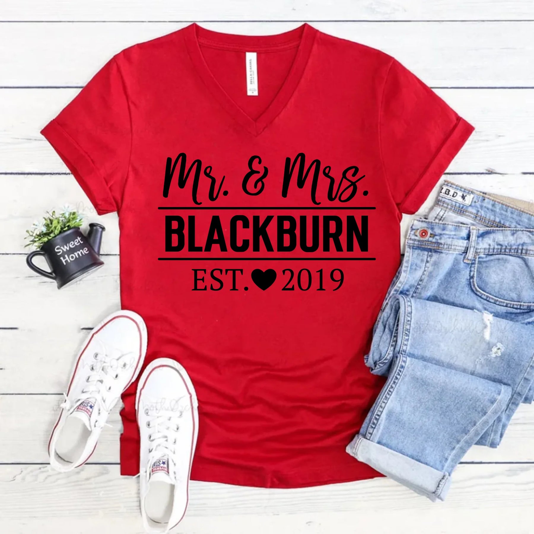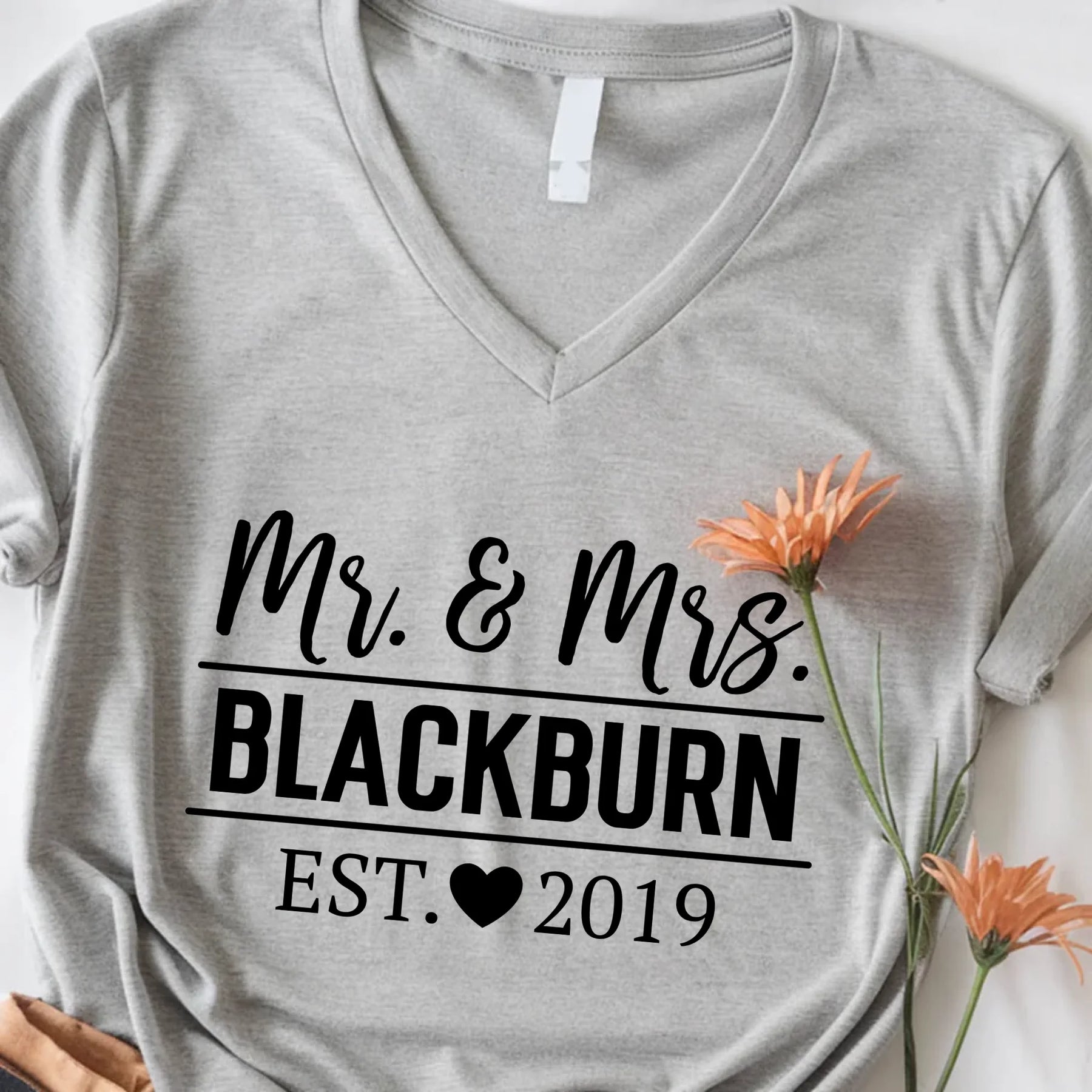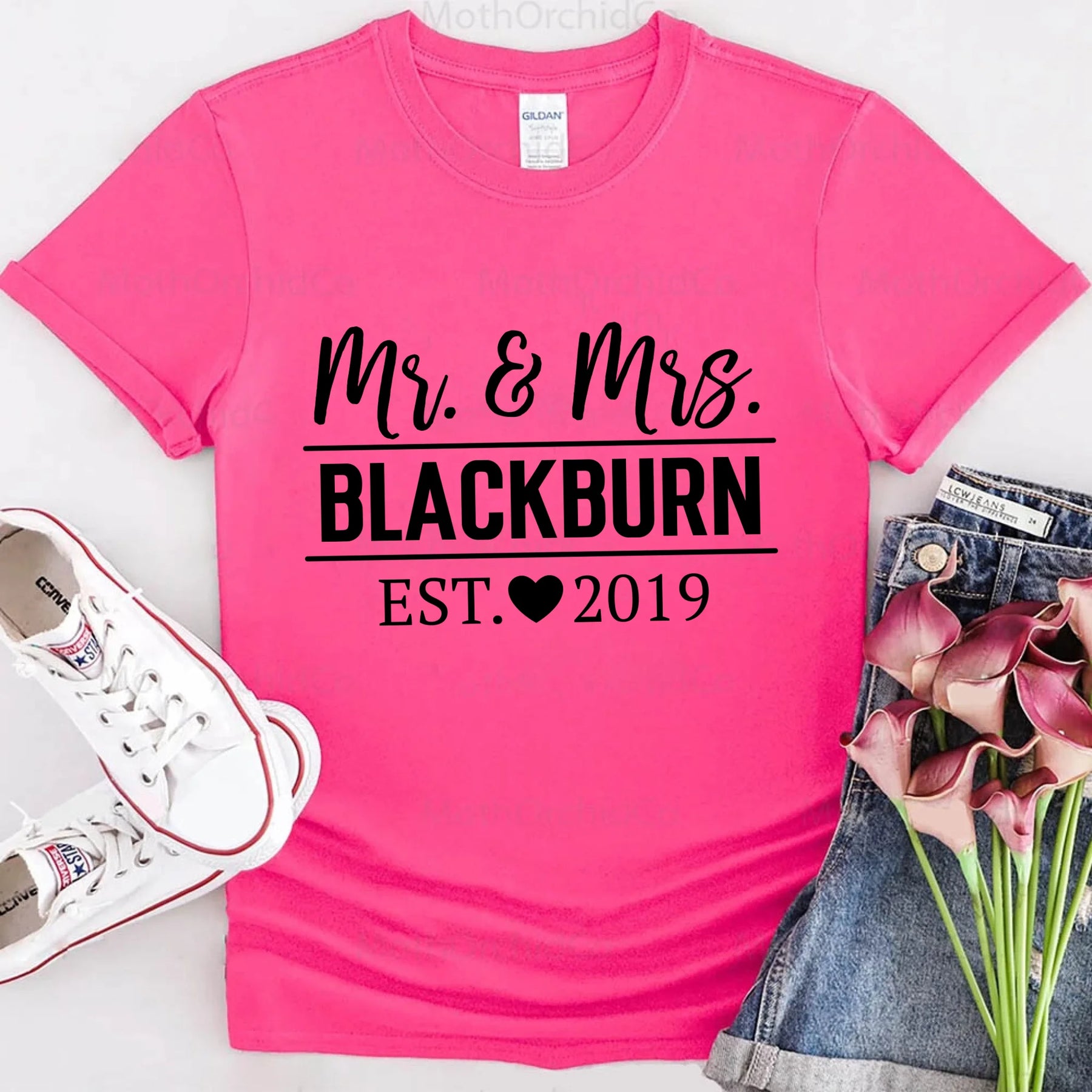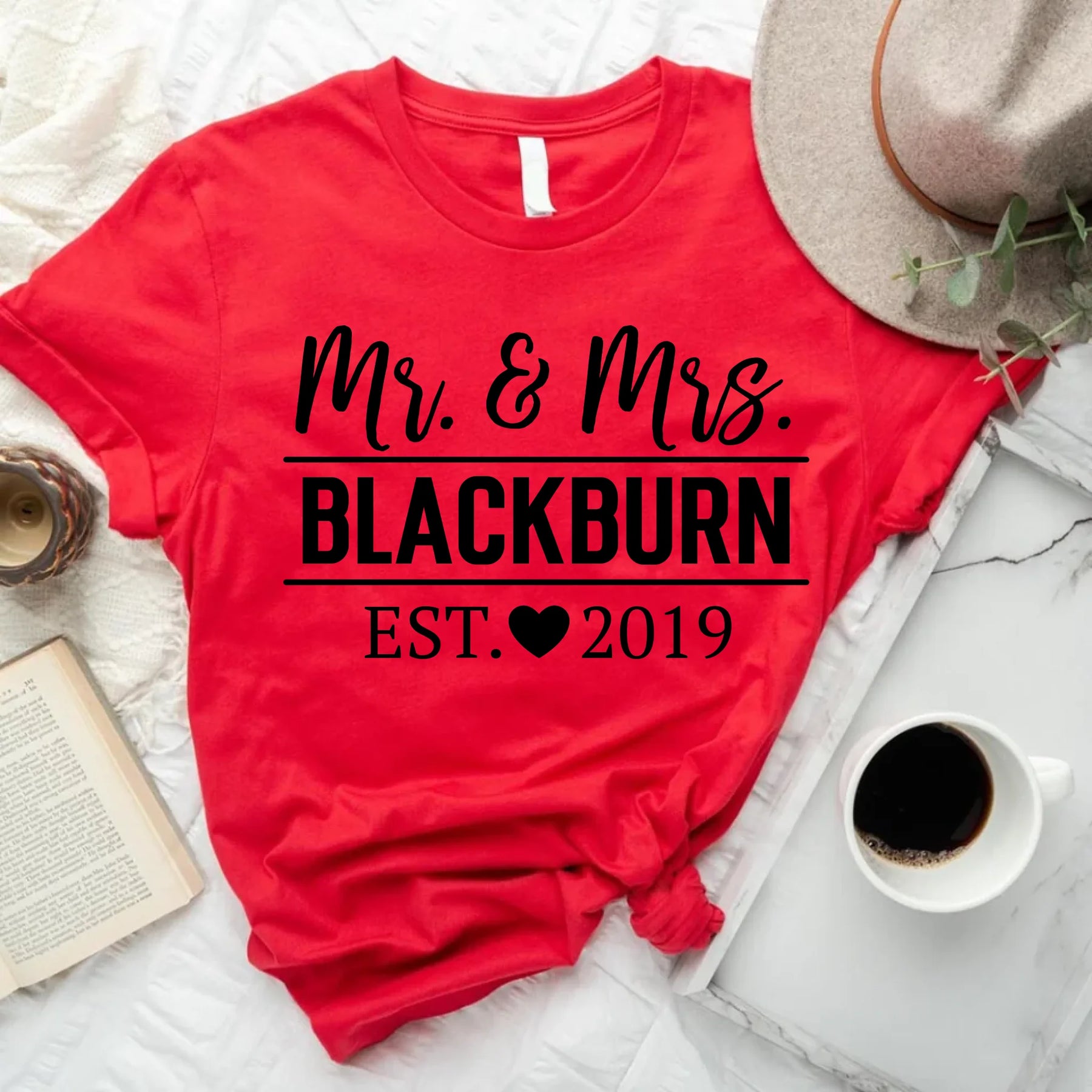 Celebrate your special bond with these personalized “Mr. & Mrs.” tees, customized with your shared last name. Perfect for weddings, anniversaries, honeymoons, or everyday wear, these matching shirts are a sweet way to show off your love story. Comfortable, stylish, and meaningful, they make a thoughtful gift for couples starting their forever together.