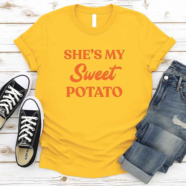 Yellow t-shirt with 'SHE'S MY Sweet POTATO' text, paired with black sneakers and blue jeans on a wooden surface.