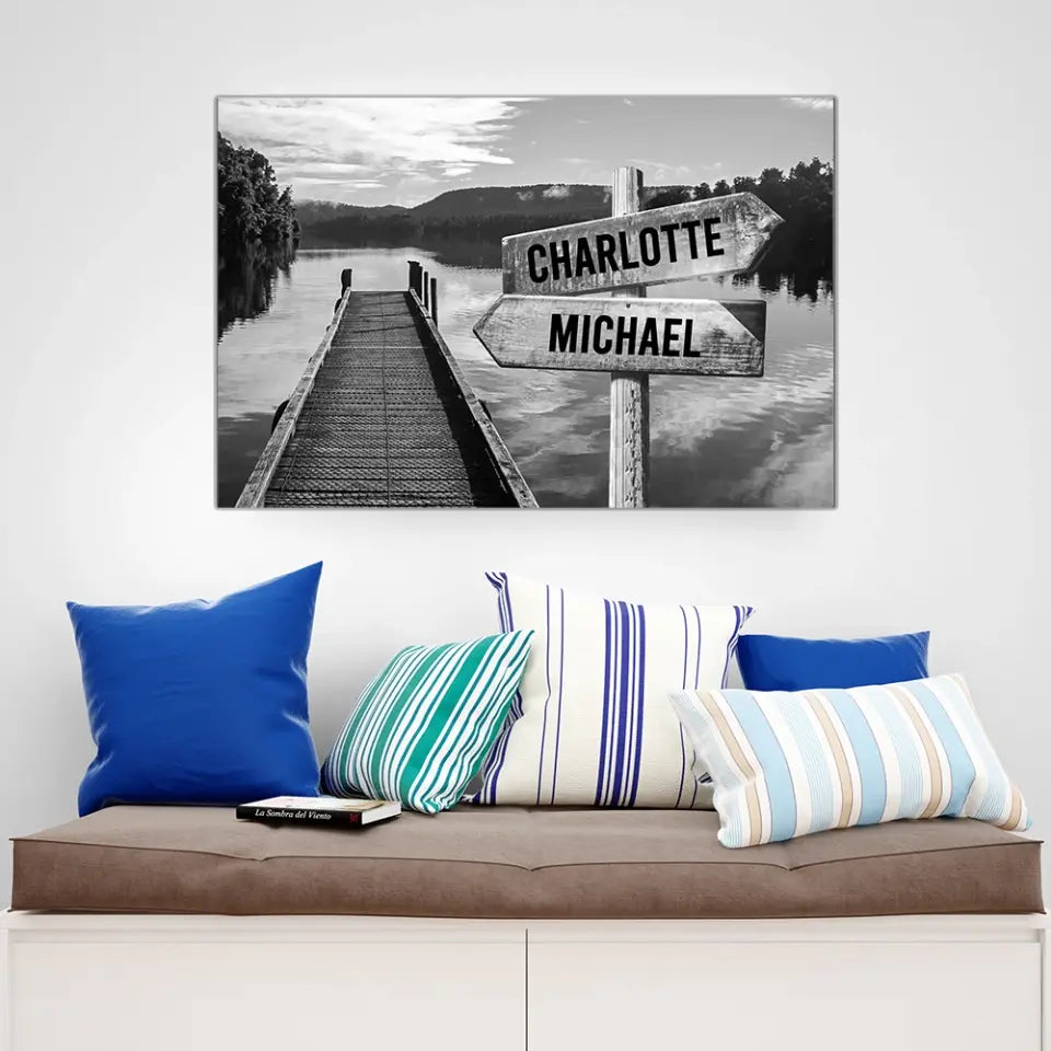 Bring your love story to life with the Lake Dock Two-Names Premium Canvas, a personalized piece of wall art designed exclusively for couples. Featuring two custom names, this romantic lakeside dock scene symbolizes togetherness, connection, and shared moments