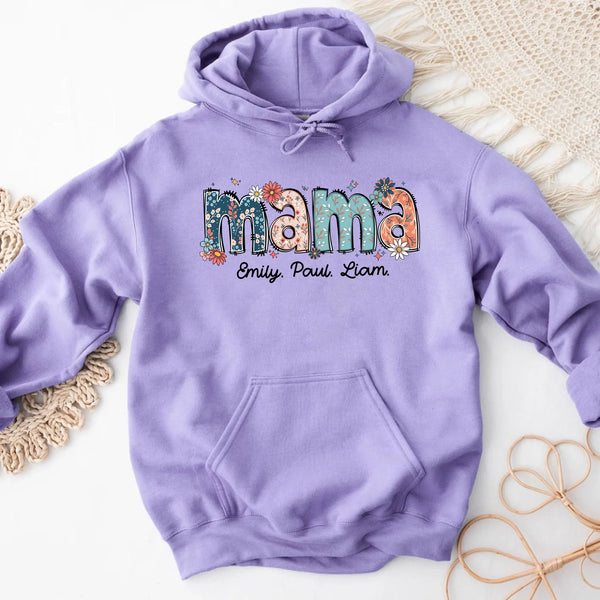 Custom Mama Hoodie – Kids’ Names with Floral Mama Text