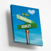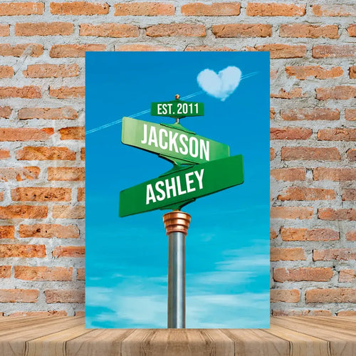 Celebrate your love with the Couples Street Sign Premium Canvas, a personalized wall art piece featuring your names on a classic street sign set against a calm blue sky with soft clouds and a heart detail. This design symbolizes direction, unity, and the journey you share together, making it a meaningful addition to your space.
