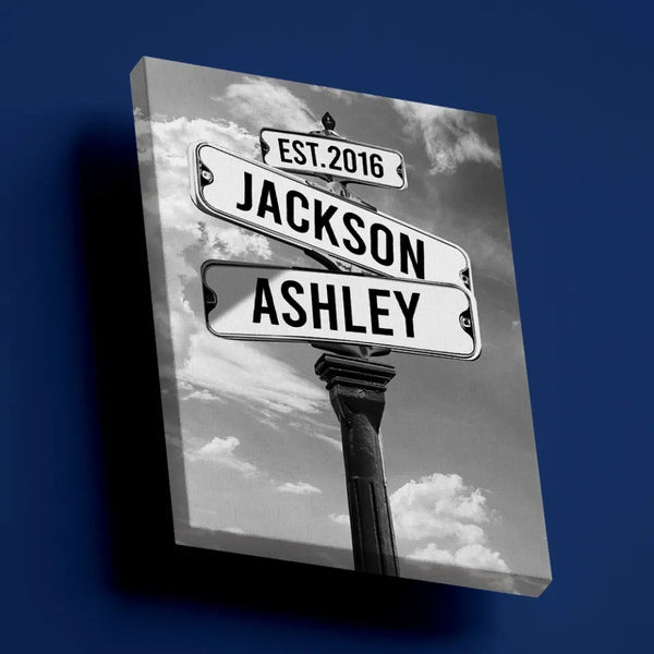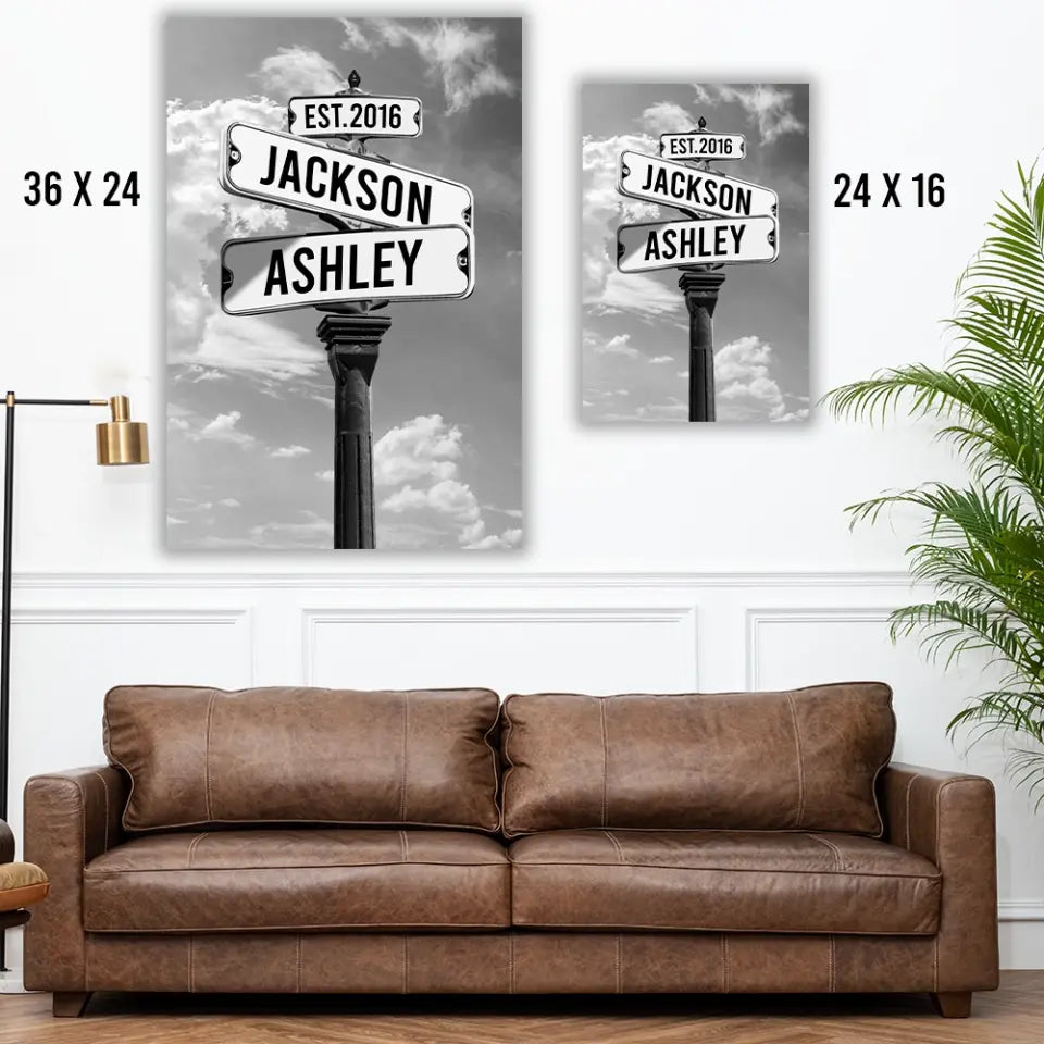 Celebrate your journey together with the Street Sign With Names for Couples Canvas, a unique and meaningful piece of wall art designed just for you. Featuring your personalized names styled like a real street sign, this canvas transforms your relationship into a timeless destination.