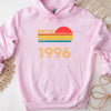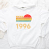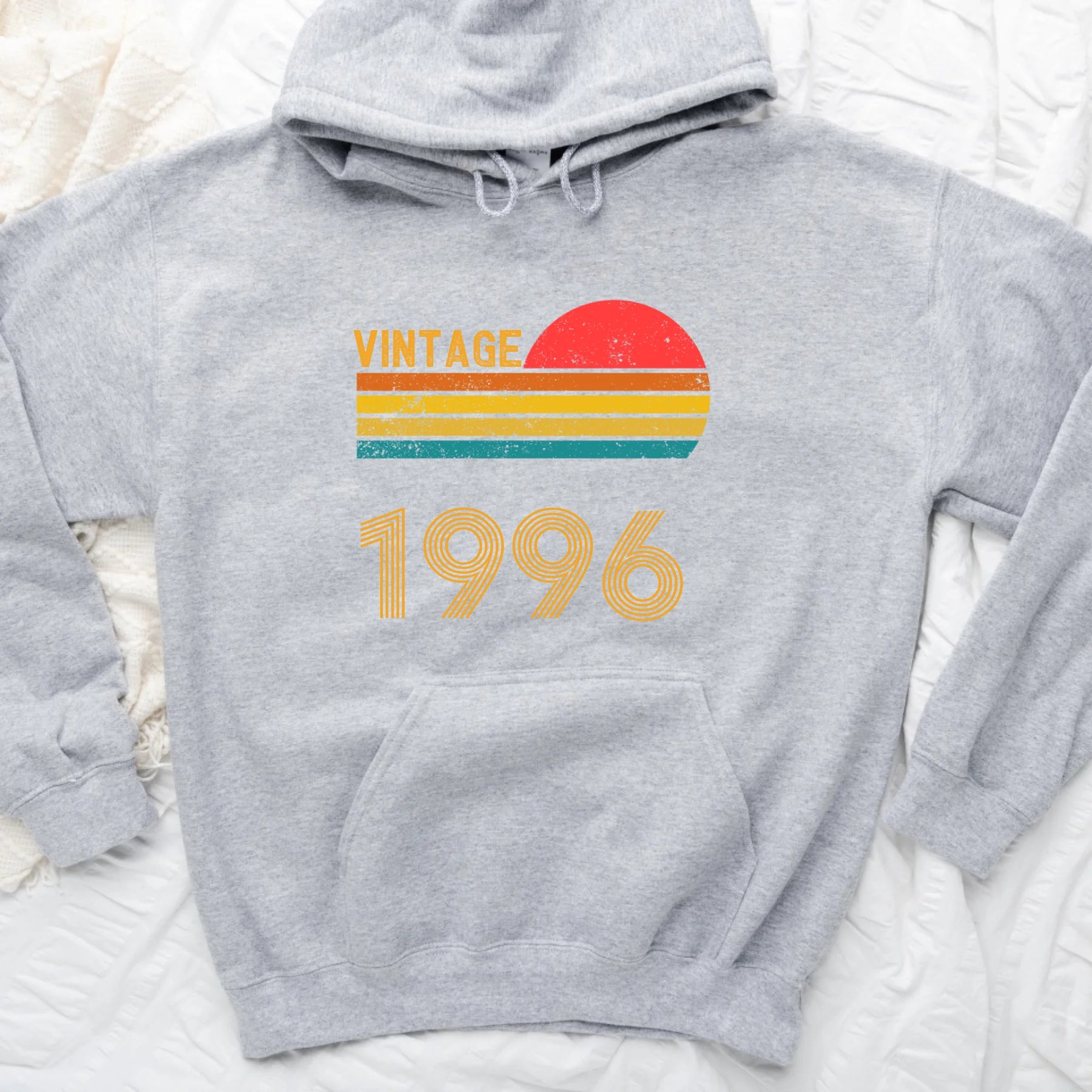 May include a personalized vintage-style hoodie with a retro sun graphic and customizable year text printed on the front.