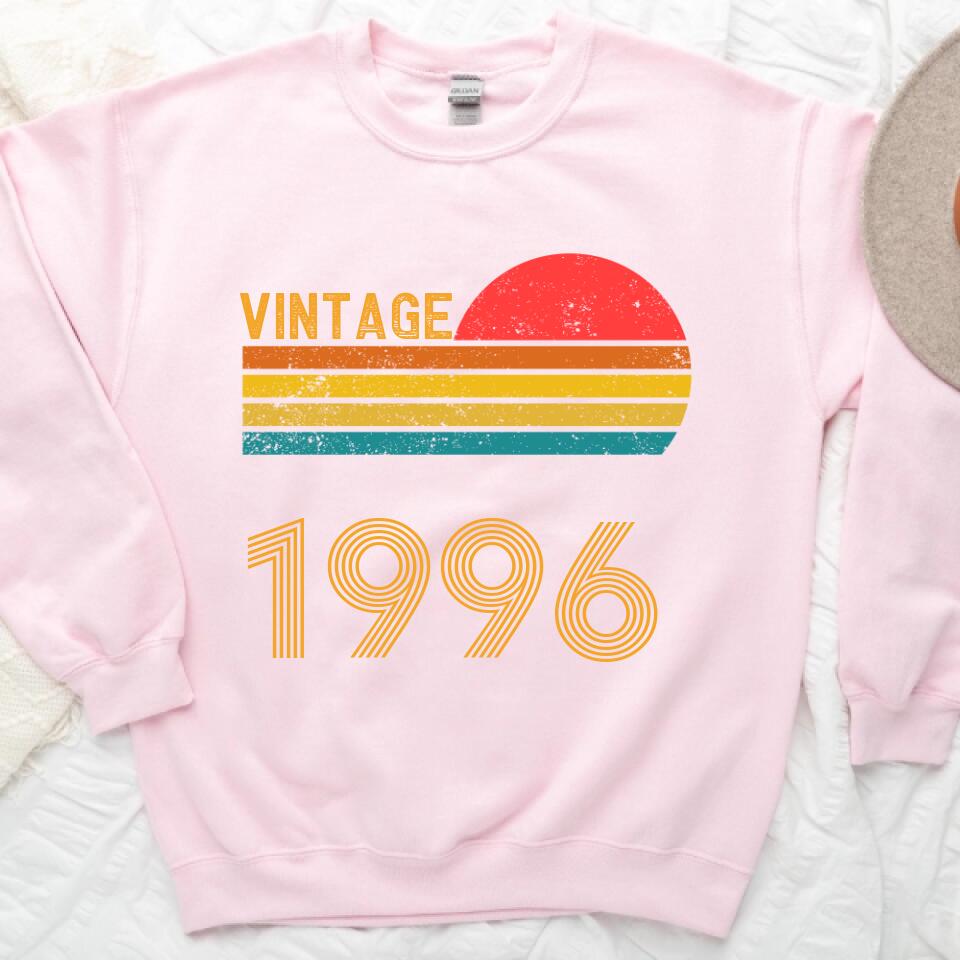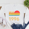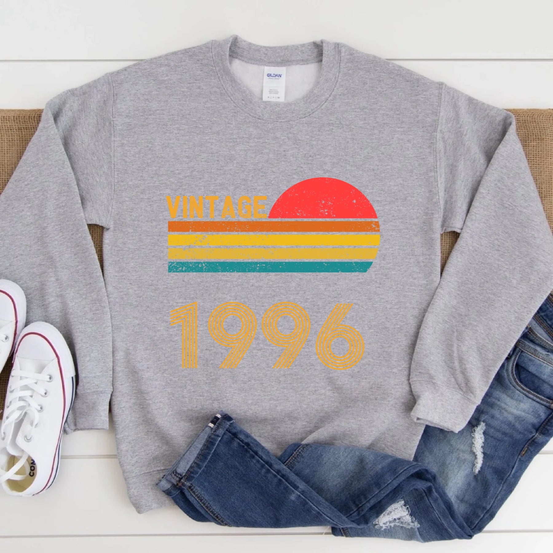 May include a personalized vintage-style sweatshirt with a retro sun graphic and customizable year text printed on the front.